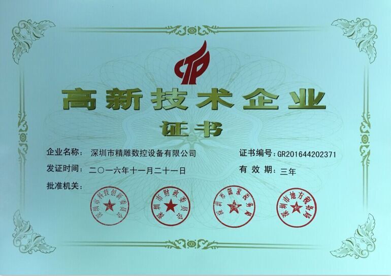 深圳市精雕數(shù)控設(shè)備有限公司2017年正式拿到國家國高企業(yè)認(rèn)定證書。